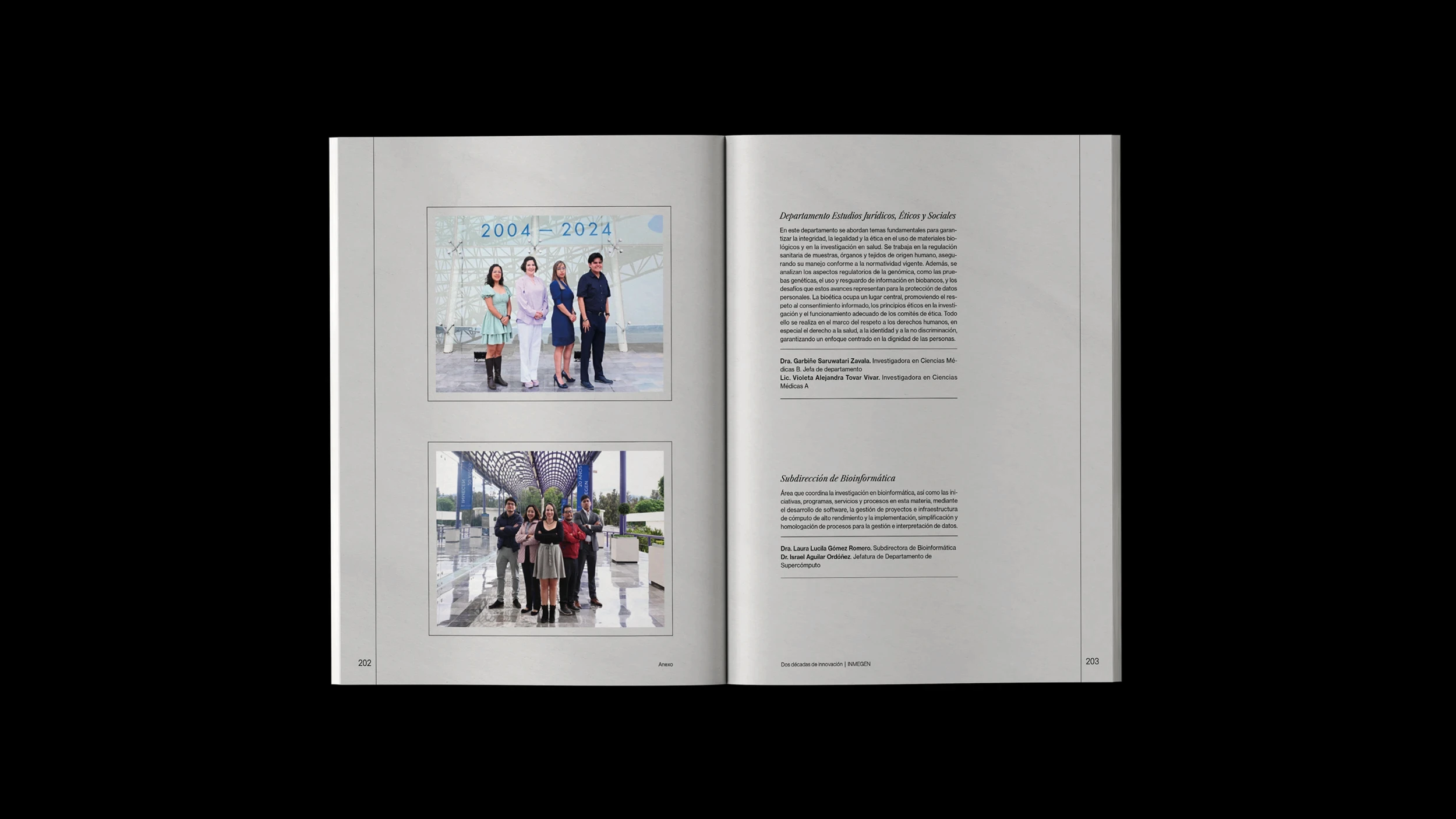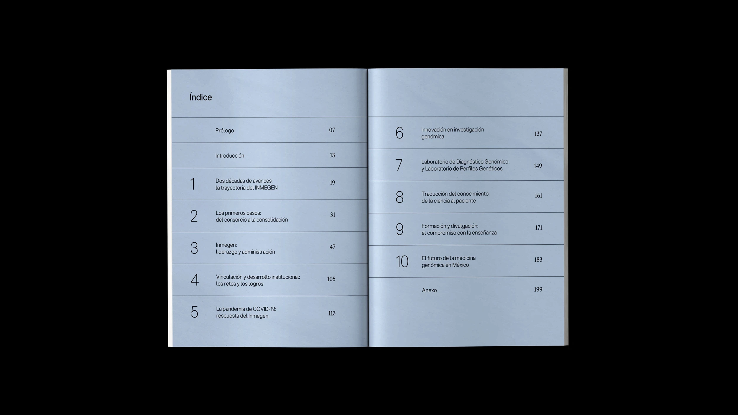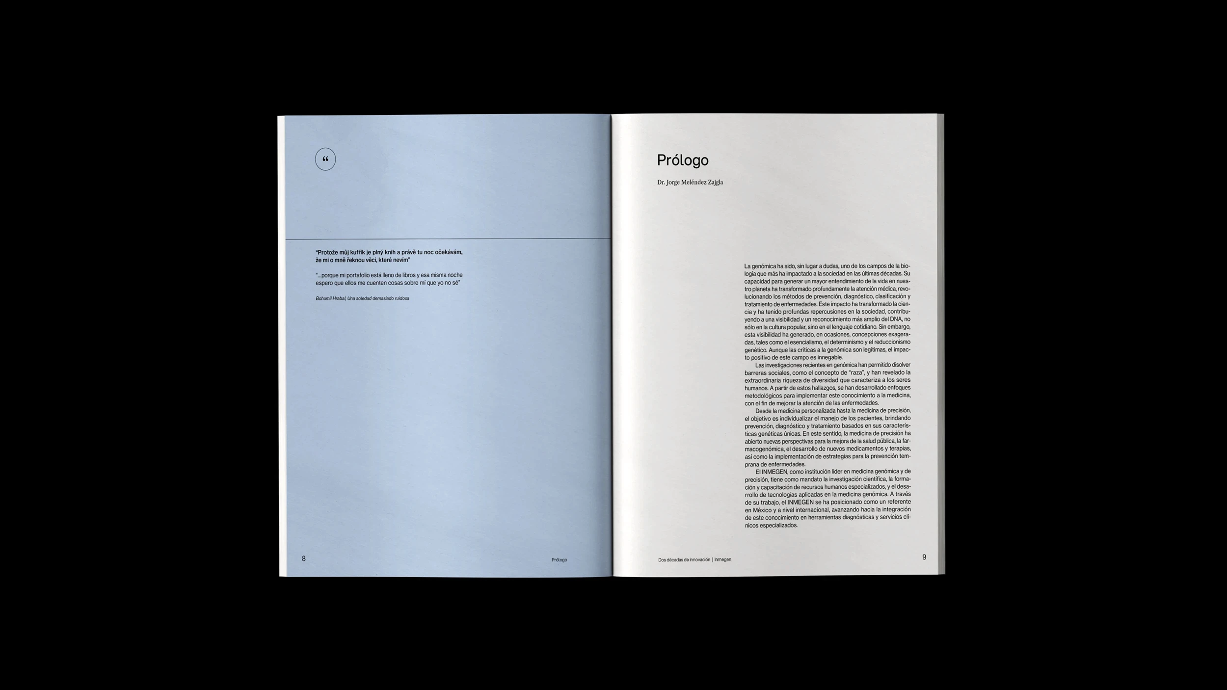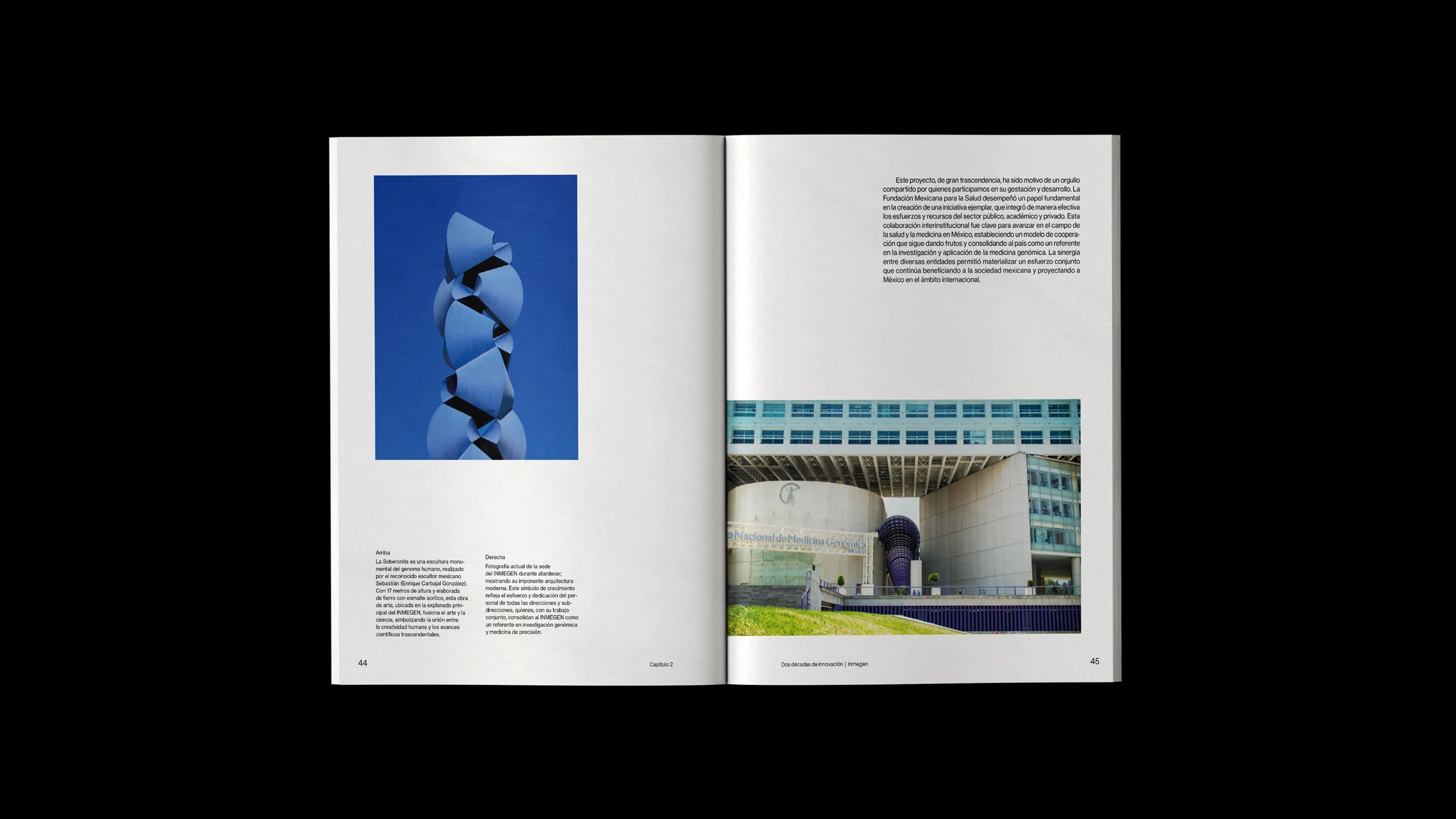 Transformando la salud en México Publicación de edición especial que conmemora veinte años del Instituto Nacional de Medicina Genómica. El proyecto propone un recorrido por su historia, aportes científicos y logros más relevantes en medicina genómica. El resultado es un diseño editorial minimalista y elegante, alineado a la identidad gráfica del vigésimo aniversario del instituto.