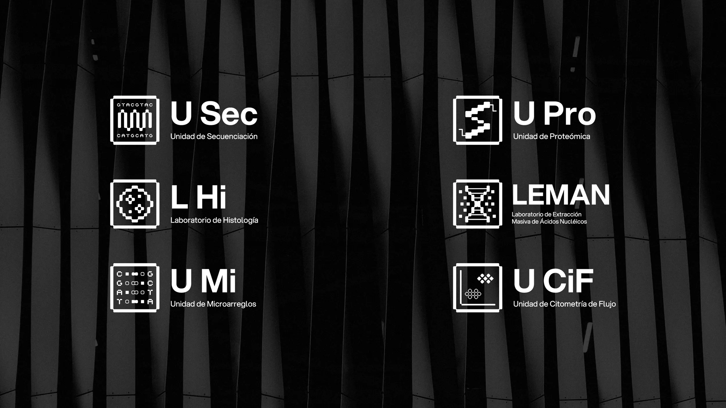 Unidades de Alta Tecnología Sistema gráfico desarrollado para las seis Unidades de Alta Tecnología del Instituto Nacional de Medicina Genómica, laboratorios dedicados a la investigación científica especializada. La propuesta busca homologar su identidad visual mediante un lenguaje contemporáneo, claro y tecnológico, que comunica innovación y rigor científico.